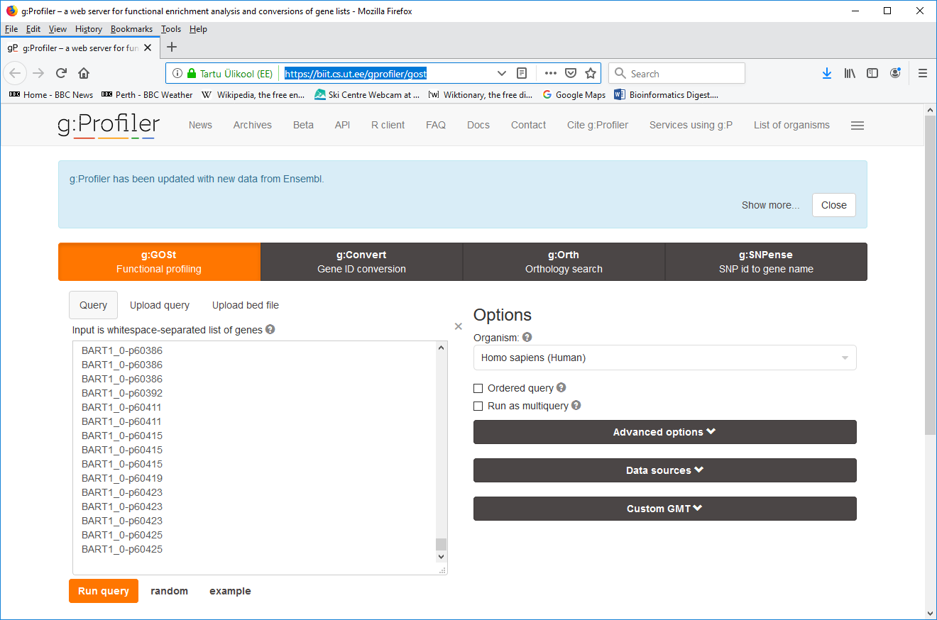 - 1. Go the gProfiler page at https://biit.cs.ut.ee/gprofiler/gost
