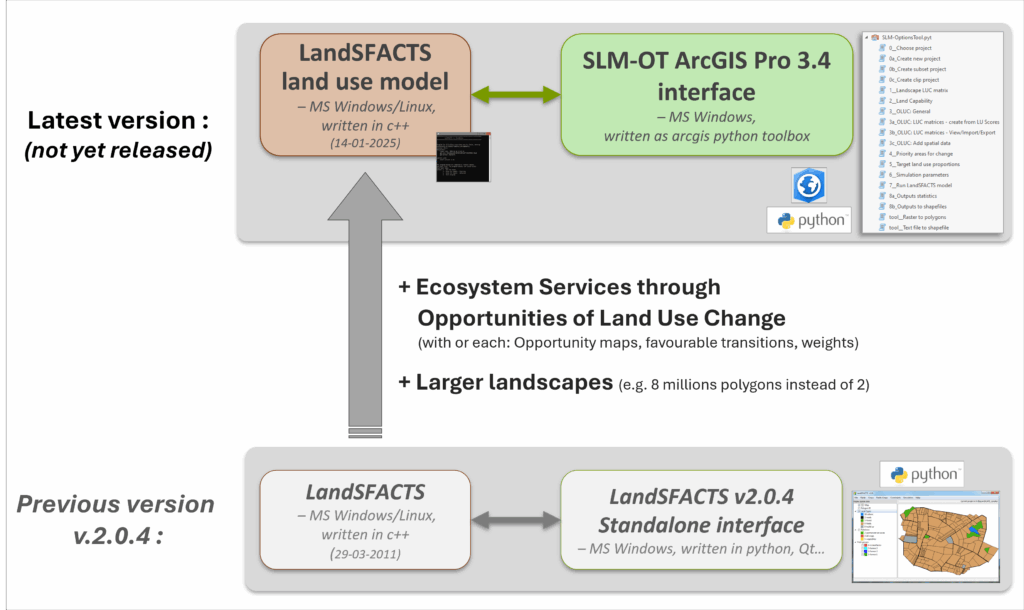 This latest version of the LandSFACTS model is not officially released yet. An ArcGIS Pro interface calling the LandSFACTS C++ executable is also under advanced development (tool named SLM-OT for Sustainable Land Management – Options Tool; originally developed with the National Trust in the Lake District). For further information or to test a pre-release version, please contact Marie Castellazzi.