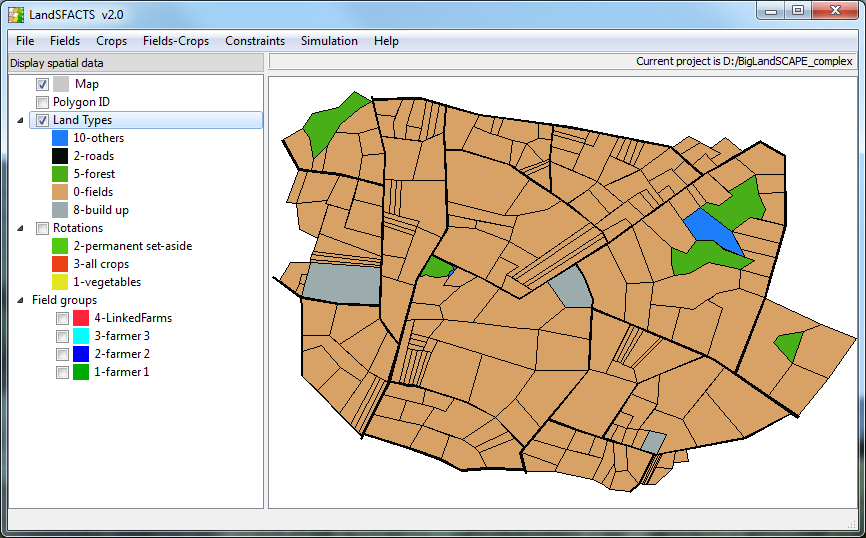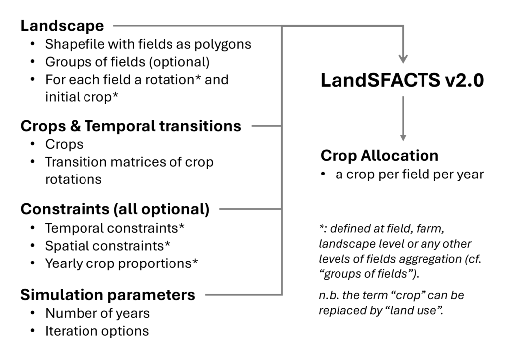 LandSFACTS v.2 (LANDscape Scale Functional Allocation of Crops Temporally and Spatially) is a modelling tool to create scenarios of crops or land uses within the landscape. The model provides a crop/ land use per land unit per year, which meets user-specified spatial and temporal constraints on the crops/land uses. The software is spatio-temporal and allows multi-scaling. The modelling is based on stochastic and rule-based processes complemented with simulated annealing. The model has been used to create scenarios of cropping systems and land uses from the farm level up to the regional scale in order to assess ecosystem services, such as biodiversity, water quality, soil erosion, carbon sequestration.