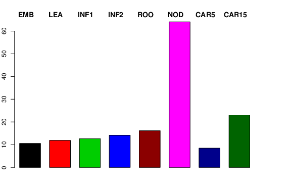 | NOD | Developing tillers at six leaf stage, 3rd internode | 16.2977 | 19.9753 | 18.7503 | 64.0576 |