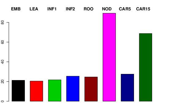 | NOD | Developing tillers at six leaf stage, 3rd internode | 23.1036 | 23.8821 | 19.2478 | 89.3096 |