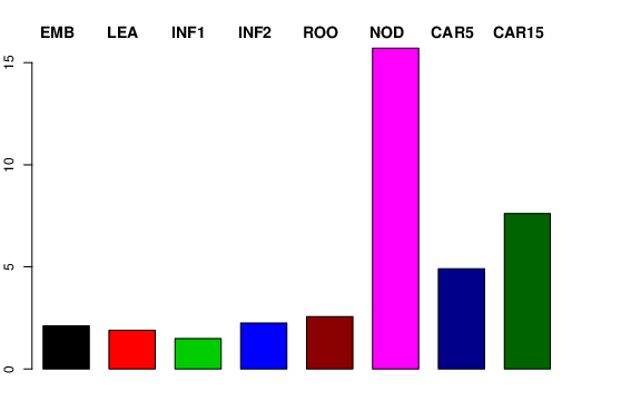 | NOD | Developing tillers at six leaf stage, 3rd internode | 1.3565 | 3.6623 | 3.65017 | 15.7151 |