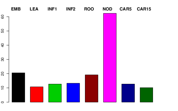 | NOD | Developing tillers at six leaf stage, 3rd internode | 24.0968 | 25.3536 | 22.6951 | 62.3838 |