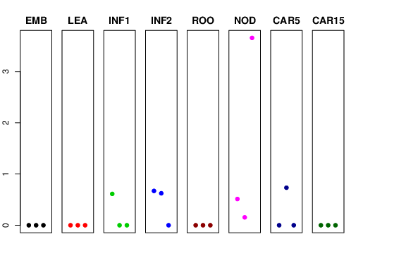 | NOD | Developing tillers at six leaf stage, 3rd internode | 0.512365 | 0.153904 | 3.65508 | 0 |