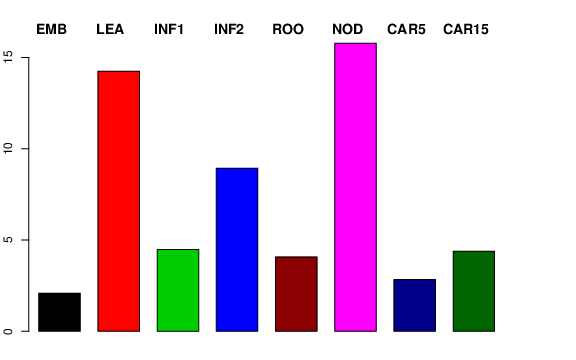 | NOD | Developing tillers at six leaf stage, 3rd internode | 2.61434 | 4.42511 | 7.26559 | 15.7779 |