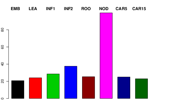 | NOD | Developing tillers at six leaf stage, 3rd internode | 16.249 | 29.2322 | 30.9547 | 99.7754 |